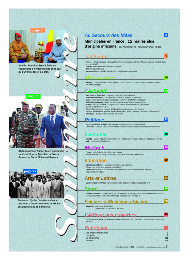 La version papier du numéro 555 d’avril disponible fin de semaine prochaine chez votre marchand de journaux. Pour l’heure, ce numéro est disponible sur la boutique d’Afrique Education. Composez le www.afriqueeducation.com et laissez-vous guider jusqu’à l’obtention du pdf.